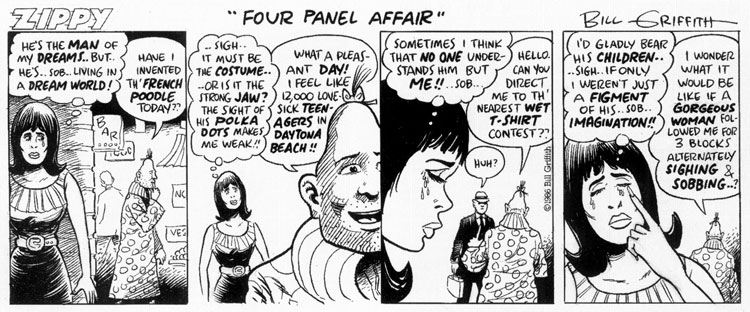 "In two decades, Bill Griffith's Zippy the Pinhead has been transformed from a one-shot gag into the idiot savant of our whirling consumer culture. Griffy's tirades against advertising, truckers' caps, and Bruce Springsteen are hilarious, but he'd be just another elitist snotball without Zippy's cut-and-paste giddiness. Together they're irrisistible: the good cop/bad cop of surrealist social criticism. Zippy's not the biggest fool this country has - we elect those - but he is our best."
