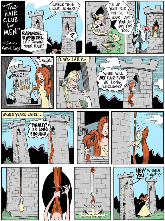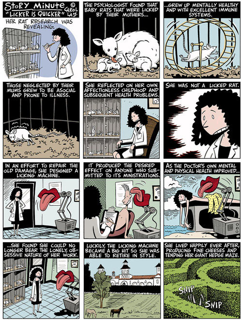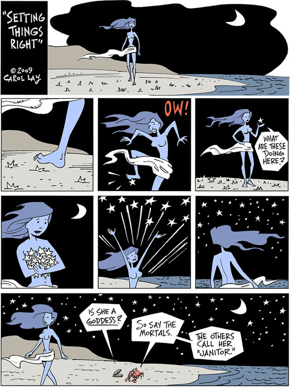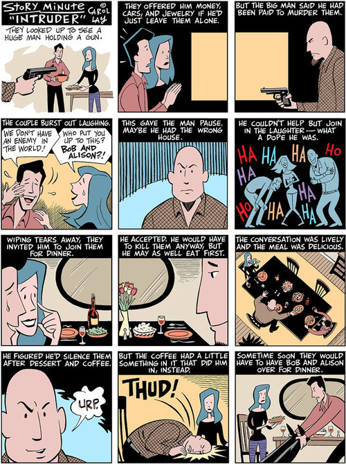 In 1990, Carol was invited to contribute a short serial to LA WEEKLY, which resulted in a 5-page story titled, “The Thing Under the Futon.” The pay was several times what independent comics paid and the audience was larger and included women (!), so Carol pursued and landed a regular spot in the paper with a weekly comic strip. “Story Minute” continues today in its current form (new stories mixed with reprints) online at GoComics.