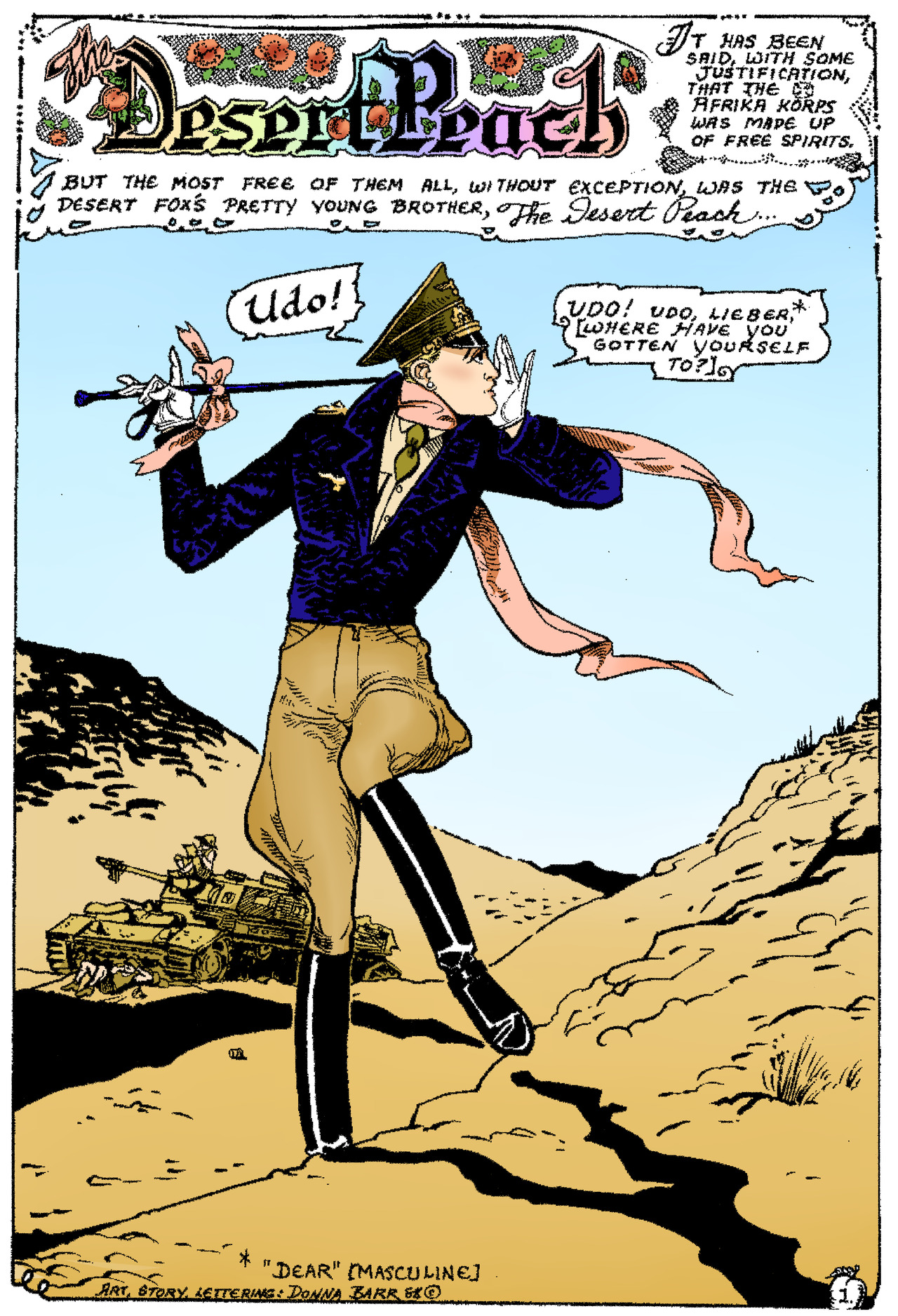 Her other long-running series, "The Desert Peach" is about Pfirsich Rommel, the fictional homosexual younger brother of Erwin "The Desert Fox" Rommel. Beginning in 1987, it was set in North Africa during World War 2. The first three issues were published by Thoughts & Images. Additional issues were published by Fantagraphics Books, Aeon Press, and then self-published. Other works include Hader and the Colonel, The Barr Girls, and Bosom Enemies. Barr has also recently published a number of novels, including Permanent Party, An Insupportable Light, and Bread and Swans. The last two of these feature "Stinz" and "The Desert Peach", respectively.