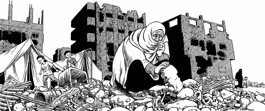 "PALESTINE" (2001), a first-person journalistic account of the situation in the occupied territories, told in sequential art form. Naseer H. Aruri, Professor of Political Science at the University of Massachusetts, Dartmouth, wrote, "Sacco brilliantly and poignantly captures the essence of life under a repressive and prolonged occupation. Each page is equivalent to an essay on one of the many aspects of the occupation. His material is presented with a great deal of skill, insight and compassion." Entertainment Weekly wrote, "It figures that one of the first books to make sense of this mess would be a comic book."