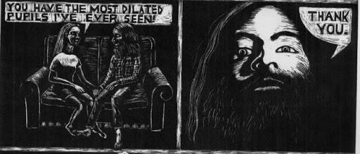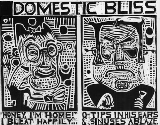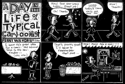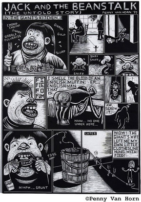 Penny Van Horn was born in Rye, New York, in 1954. She started her career in publishing and moved to Texas in 1984. Around this time, she started doing comics, especially inspired by some comics in the back of National Lampoon. She works primarily in scratchboard, linoleum and wood block. She has published work in Weirdo, Wimmen's Comix, Snake Eyes, Twisted Sisters I & II and Zero Zero. Penny had a weekly strip in the Austin American-Statesman and illustrated for The Austin Chronicle.