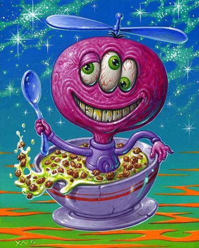 In the 90ıs his career got a kick-start with a show at La Luz De Jesus Gallery alongside R.K. Sloane. Since then he has done several one-man shows and has been in many group shows including New Yorkıs psychedelic Solution and Los Angelesıs Tamara Bane Gallery. He was even in a show at the Laguna Art Museum last year. He has done skateboard designs for Veriflex and surfboard graphics for Slap On. He has been published IN Thrasher magazine, Hustler magazine and a card series for Topps bubble gum called, Dinosaurs Attack. He even did a stint at MTV with some computer animation.