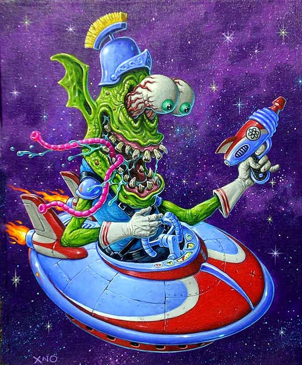 XNO started his career at Memphis Art College in the 80ıs. He started doing illustrations for a punk rock magazine called Malice where he got his name, XNO. Soon he was doing self-published underground comics with his own company XEX graphics. This led to him getting published in R. Crumbs comic Weirdo and Ray Zones 3d comics with such notables as R.K. Sloane and Big Daddy Roth.