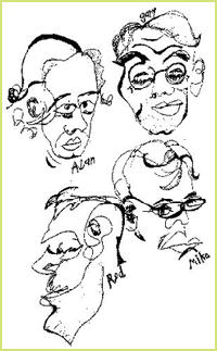 The group is in strong support of comics as a vital means of self expression and "believe that comics are meant to be read, not hermetically sealed and stored in vaults." They're concerned about the future of the industry and advocate comics that are less mainstream that Superman, and "promote artists whose work stretches the boundaries of the form" by getting work out there. I asked them why this was important to them, and while they were expounding into my tape recorder, I covertly sketched their portraits under the guise of taking copious notes while nodding affirmatively at the proper junctures.
