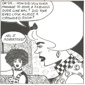 Born in Brooklyn, New York, in 1947. Attended the High School of Music and Art, in Manhattan, Brooklyn College and the Pratt Institute. First published in Wimmen's Comix 2, 1973. Her work has been published in Wimmen's Comix, Young Lust, Twisted Sister Comics, Arcade, Weirdo and her solo comic book, True Glitz. She has been edited and appeared in Twisted Sisters (Penguin Press), an anthology, and the new Twisted Sisters: Drawing the Line. Her work was made into a play in 1981. She has shown at La Luz de Jesus Gallery, in Los Angeles, and the Cartoon Art Museum in San Francisco, where she has curated and participated in the Twisted Sisters show. She lives in San Francisco, California.