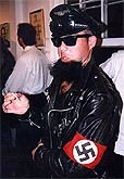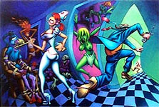 The Pizz. Self-taught, self-employed, and self-destructive, Pizz took a self-imposed break from painting during which he explored other media, such as magazine illustration, TV commercial design work, and computer animation. The break has done him good - the new crop of acrylics are his best work so far, presenting a quantum leap in form, style, and structure. Heightened color; torqued-into-overdrive radical perspective; density of imagery and twisting narrative distinguishes each piece from the other in style, subject matter, and delivery. Avoiding the E-Z marketing schemes of many of his artistic brethren, The Pizz stays true to his underground roots and uses the medium of painting as a forum to launch into his diatribes, rants, and dissertations against various perceived evils, sacred cows, and questionable institutions.