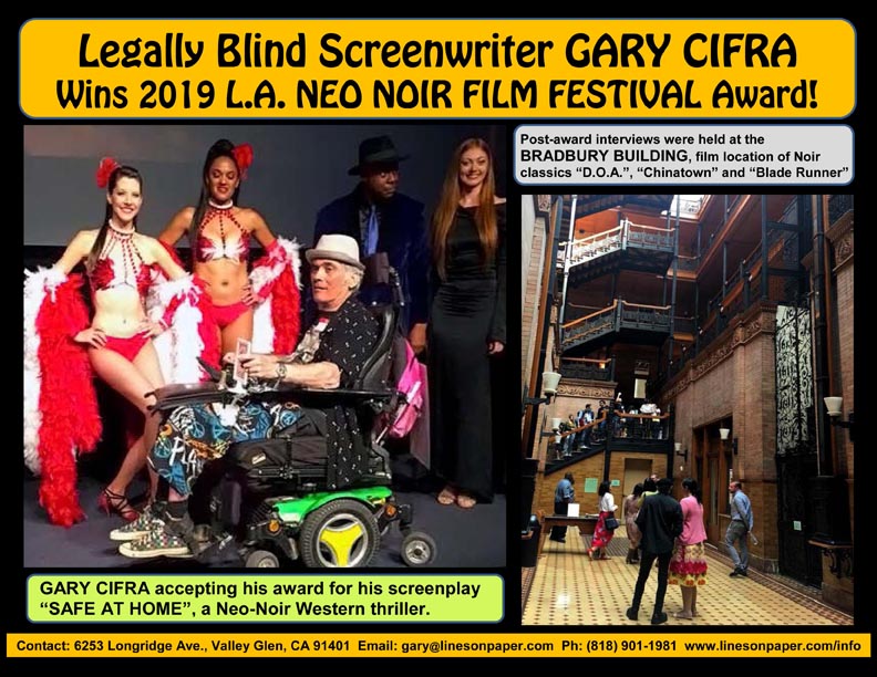 My other screenplay, “SAFE AT HOME”, a Neo-Noir Western/Erotic Thriller, won at the 2019 L.A. Neo Noir Novel, Film, and Script Festival, and won as a Semifinalist in both the 2021 Scriptapalooza and 2021 Your Script Produced screenplay contests.