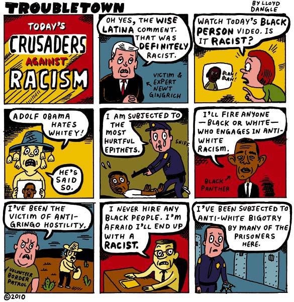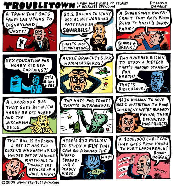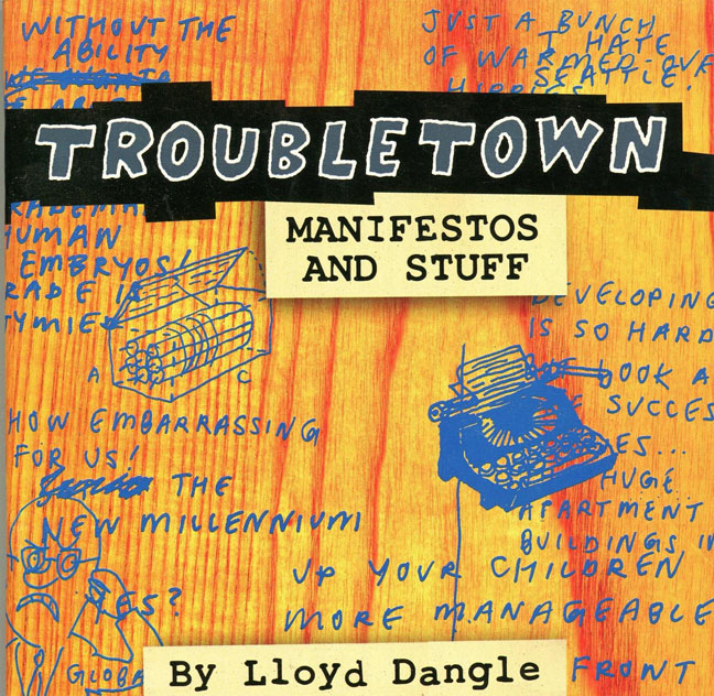 Troubletown is a syndicated weekly comic strip by Dangle. Begun in 1988 at the San Francisco Bay Guardian, it went on to run in many alternative press weeklies including The Stranger, The Portland Mercury, and the Austin Chronicle. It also appears regularly in The Progressive magazine. Most strips involve political satire from a liberal perspective. Several book collections of Troubletown have been published. It is also featured in the anthology Attitude: The New Subversive Cartoonists.