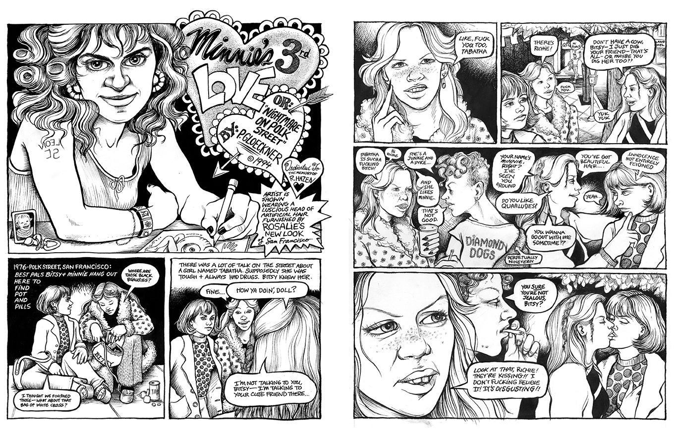 Her early comics work, in the form of short stories published in a variety of underground anthologies including "Wimmen's Comix", "Weirdo","Young Lust" and "Twisted Sisters".